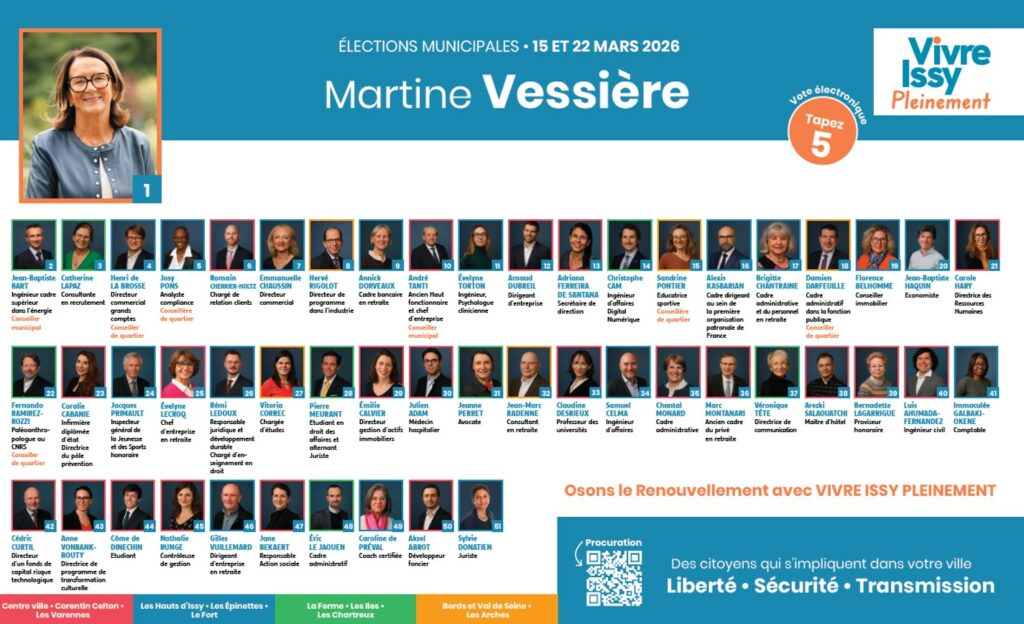 Depuis 2020, Vivre Issy Pleinement dispose de 3 élus au conseil municipal d’Issy-les-Moulineaux grâce à vos suffrages.